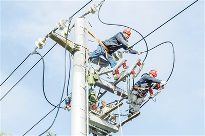 國網(wǎng)漯河供電公司工作人員正在架設(shè)線路。