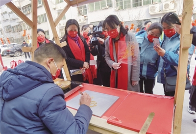 活動(dòng)現(xiàn)場(chǎng),各類新鮮年貨、特殊手工藝品、土特產(chǎn)等應(yīng)有盡有。“真好看,舍不得吃!”在一處傳統(tǒng)糖畫攤位前,隨著縷縷糖絲飄下,不到一分鐘,一只栩栩如生的玉兔就呈現(xiàn)在眼前了。拿到糖畫的小朋友一邊贊嘆制作過程的神奇,一邊忍不住舔上一口。