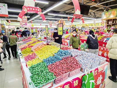 當(dāng)天下午,記者來到遼河路丹尼斯超市。超市內(nèi)紅色成了主色調(diào),洋溢著濃濃的喜慶氣氛。福字、中國(guó)結(jié)等傳統(tǒng)擺飾已經(jīng)上架,糖果、巧克力、餅干等年貨琳瑯滿目,水果、蔬菜、干貨、大米等商品也非常充足。