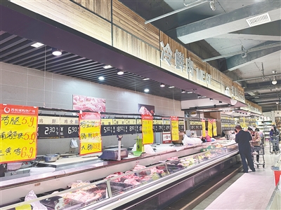 市區(qū)某購(gòu)物廣場(chǎng)生鮮區(qū)的燈光統(tǒng)一,均呈暖白色。肉類在這樣明亮的燈光下呈現(xiàn)出正常顏色。