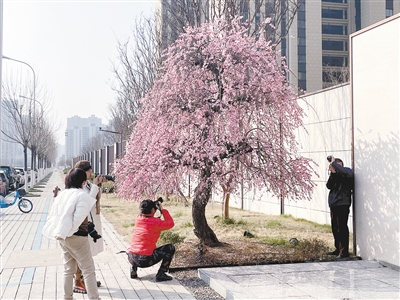 3月14日,在市區(qū)王屋山路蘇荷象灣壹號小區(qū)門前,兩株盛開的龍梅形成兩團巨大的粉色花簇,吸引不少市民圍觀拍照。