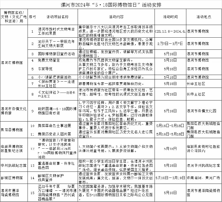 漯河市博物館將走進(jìn)長申玉社區(qū),通過《探秘賈湖》課程講解賈湖文化,探尋中華文明曙光;通過開展文創(chuàng)體驗活動,向公眾展示市博物館文創(chuàng)產(chǎn)業(yè)發(fā)展成果。同時市博物館還將組織文物專家在大廳為市民免費鑒定文物,普及文物知識。