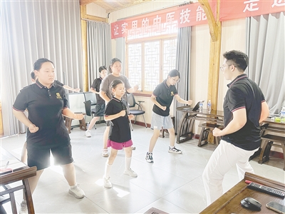 目前正值暑假,知育學堂內(nèi)的青少年中醫(yī)夏令營活動正在進行中。記者在夏令營的活動教室看到,十幾個孩子跟著老師練習八段錦。參加夏令營的孩子們來自天津、河北、鄭州等。“我媽媽從河北開車把我送到這里,主要是為了培養(yǎng)我對中醫(yī)的興趣,讓我了解如何調(diào)理自己的身體。”今年12歲的陳榮告訴記者。