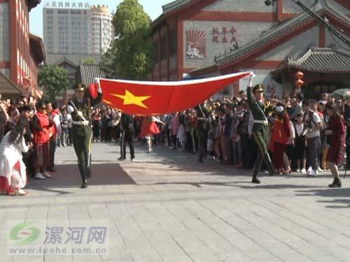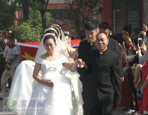 今年的青年集體婚禮,漯河市首次將“愛(ài)國(guó)文化元素”融入其中,特別邀請(qǐng)了天安門(mén)原國(guó)旗護(hù)衛(wèi)隊(duì)、中國(guó)第一國(guó)旗手高紅浦及戰(zhàn)友現(xiàn)場(chǎng)舉行升旗儀式。上午9點(diǎn),莊嚴(yán)肅穆的升國(guó)旗儀式開(kāi)始,12對(duì)新人和現(xiàn)場(chǎng)的親朋好友在飄揚(yáng)的國(guó)旗下共唱國(guó)歌。升旗儀式結(jié)束后,高紅浦和戰(zhàn)友還給每對(duì)新人送上了一面鮮艷的五星紅旗作為新婚禮物。
