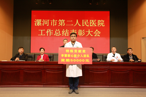 隨后表彰了2017年度先進(jìn)集體和先進(jìn)個(gè)人以及榮獲上級(jí)部門榮譽(yù)稱號(hào)個(gè)人,而含金量最高、最為榮耀,備受該院全院?jiǎn)T工矚目的“特殊貢獻(xiàn)獎(jiǎng)”李慧新及心臟介入中心團(tuán)隊(duì)作為壓軸大獎(jiǎng)?lì)C發(fā)。