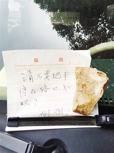 記者注意到,該車的擋風(fēng)玻璃上有半塊磚頭,磚頭下方壓著一張字條。字條上寫著“請(qǐng)不要把車停在路口,好嗎?謝謝!”