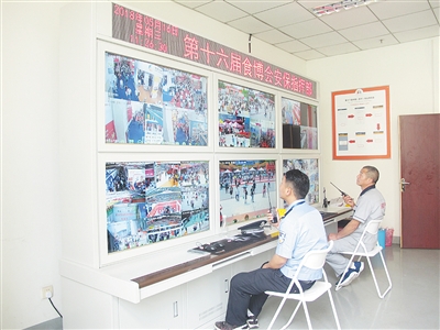 5月16日上午,記者在市科教文化藝術中心監(jiān)控室看到,安保人員正在監(jiān)控屏幕前用對講機和外圍警力進行調度工作。