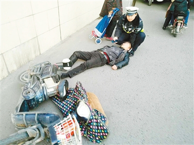 由于圍觀群眾越來(lái)越多,隨后趕來(lái)的幾名輔警一邊疏散人群、一邊疏導(dǎo)交通。張斌怕男子頭躺在地上太涼,就一直用手托著他的頭。