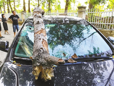 “上午10點半左右,我聽見窗外呼隆一聲,往外一看,一輛車被粗大的樹枝砸了。”6月30日下午,住在小區(qū)10號樓的李先生對記者說,樹枝是從小區(qū)院外的一棵枯樹上斷裂掉落的。除了砸到一輛車,還砸爛了10號樓2單元3樓一住戶家的玻璃。
