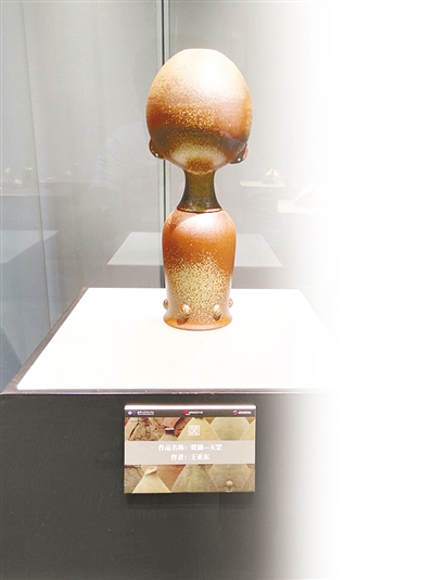 《賈湖——天罡》的創(chuàng)作者王亞?wèn)|告訴記者,這件作品整體高99厘米、直徑36厘米,厚重中帶有靈氣,酷似9000年前抽象的“賈湖美女”。創(chuàng)作理念來(lái)源于舞陽(yáng)賈湖遺址出土的乳丁陶器和雙耳陶器,采用傳統(tǒng)的手工拉胚制作工藝和柴燒落灰還原燒制工藝,材料選自沙河濕地黃膠泥和黑膠泥混合加沙燒制而成。