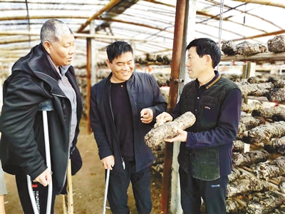 劉五中(右一)講解香菇種植技術(shù)。