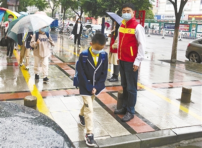 “路上小心,不要扎堆,注意間隔一米以上……”5月7日下午,天下著蒙蒙細(xì)雨,在源匯區(qū)受降路小學(xué)門(mén)口,身穿紅馬甲的馮濤不時(shí)提醒排隊(duì)放學(xué)的學(xué)生注意間隔距離。一些學(xué)生路過(guò)時(shí),主動(dòng)向馮濤問(wèn)好、鞠躬。