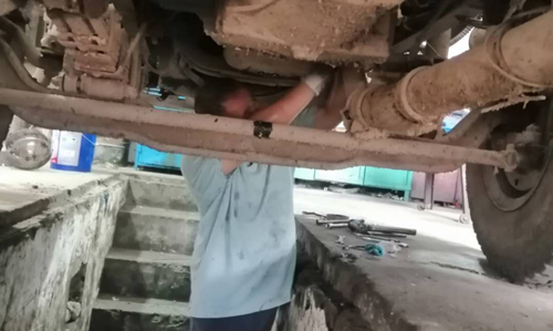 “把黃油遞給我”,這是該中心修理廠張長奇的聲音,8月13日11點(diǎn)半,只見他蹲在1米多深熱浪滾滾的水泥地溝里,藏藍(lán)色工作服已經(jīng)沾滿了油污,手套早已變得烏黑,握著工具在地溝里查看車輛底盤,他揮汗如雨,頭發(fā)衣服被汗水和車上滴下來的污水侵染,散發(fā)出一股刺鼻的異味。地溝很暗,借著工作燈照射過來的燈光,張長奇準(zhǔn)確地往加油口打入了黃油。