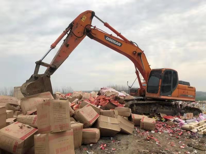 展示活動(dòng)結(jié)束后,一箱又一箱的假冒偽劣商品被運(yùn)輸?shù)绞欣盥駡?chǎng)進(jìn)行集中銷毀。一輛鏟車在轟鳴聲中進(jìn)入銷毀現(xiàn)場(chǎng),對(duì)現(xiàn)場(chǎng)堆積的假冒偽劣商品進(jìn)行反復(fù)碾壓,壓碎后再將垃圾進(jìn)行統(tǒng)一的無害化處理。