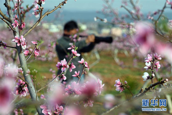 3月22日,云南省曲靖市沾益區(qū)炎方鄉(xiāng)炎方村的農(nóng)民在果園里作業(yè)。 春季里,云南省曲靖市沾益區(qū)鄉(xiāng)村果園里的桃花梨花競(jìng)相綻放,景色秀美,吸引游人前來(lái)觀光。 新華社記者 楊宗友 攝