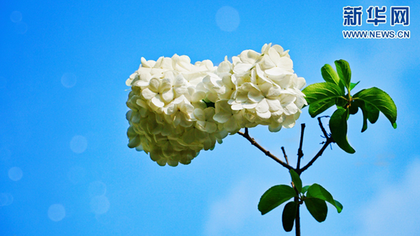 清風(fēng)徐來,一團(tuán)團(tuán)繡球花簇輕輕搖擺,淡雅肅靜地綻放在明媚的春光中、湛藍(lán)的天空下,驚艷了時(shí)光。