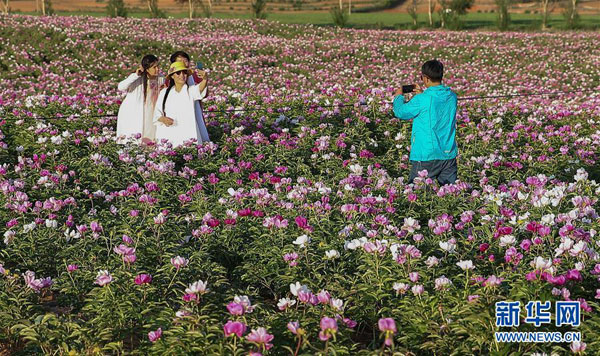 6月1日,游客在大板鎮(zhèn)三家子村中草藥種植基地的芍藥花海中拍照。 近日,遼寧阜新蒙古族自治縣大板鎮(zhèn)三家子村中草藥種植基地的600余畝芍藥進入盛花期,吸引游客前來觀賞游玩。? 新華社記者龍雷攝