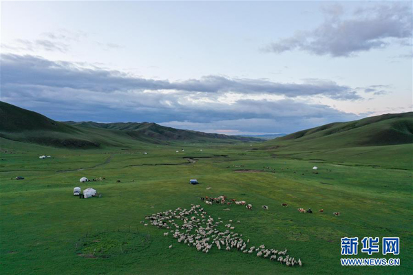 牧群和蒙古包分布在阿魯科爾沁草原上(6月3日攝,無(wú)人機(jī)照片)。