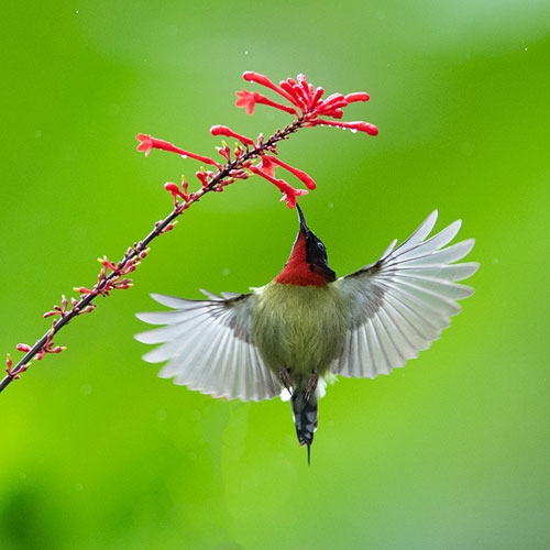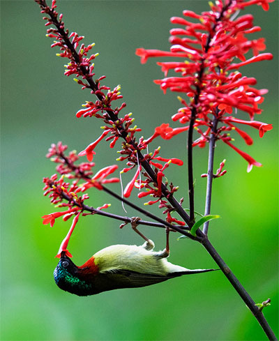 初冬時節(jié),福建省福州國家森林公園內(nèi)的紅苞花競相綻放,吸引了大批叉尾太陽鳥前來采蜜。叉尾太陽鳥又名亞洲蜂鳥,是福州特有的“明星鳥”。
