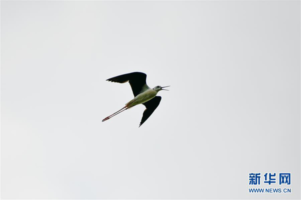 7月23日,一只黑翅長(zhǎng)腳鷸在天津大黃堡濕地自然保護(hù)區(qū)上空飛翔。新華社發(fā)(孫凡越 攝)