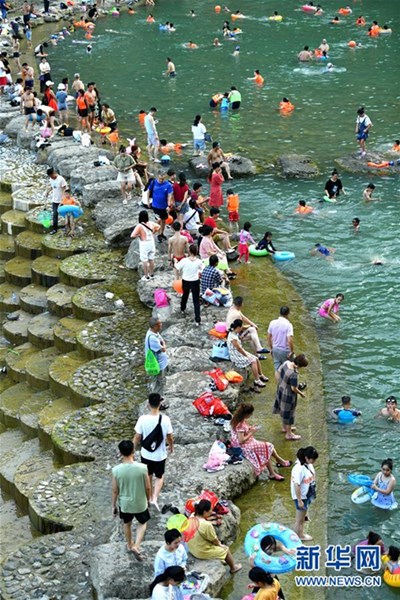 8月5日傍晚,人們?cè)诤笔⌒骺h城貢水河游泳區(qū)內(nèi)游泳消暑。 湖北省恩施土家族苗族自治州宣恩縣在穿城而過的貢水河兩岸設(shè)立了親水步道、游泳戲水、劃船健身、休閑納涼等區(qū)域,并建設(shè)更衣室、休閑座椅、公共直飲水等基礎(chǔ)設(shè)施,方便人們共享貢水河帶來的夏日清涼。 新華社發(fā)(宋文 攝)