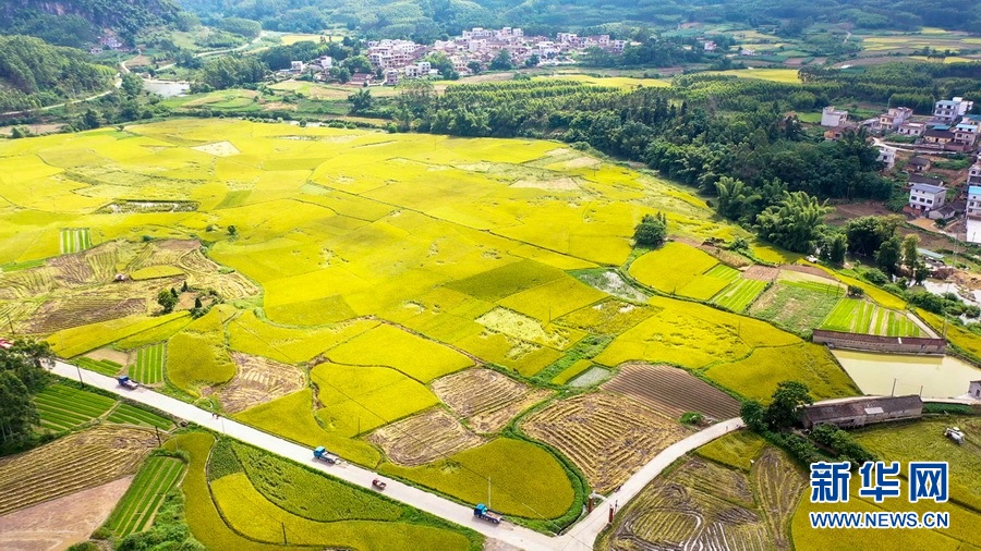 近日,在廣西柳州市魚峰區(qū)里雍鎮(zhèn)龍江村,各種農(nóng)用機(jī)械開進(jìn)場,拉開了早稻收割的序幕。一眼望去,成片的早稻在陽光下金燦燦一片,當(dāng)?shù)剞r(nóng)民抓緊晴好天氣收獲歸倉。