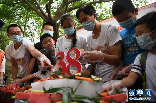 8月16日,參加“新星”38歲生日會的大熊貓“粉絲”在協(xié)助動物園工作人員制作水果生日蛋糕。 當日,世界現(xiàn)存最年長圈養(yǎng)大熊貓“新星”迎來38歲生日,重慶動物園為“老壽星”舉行了生日會。“新星”的年齡相當于人類的110至150歲,目前身體狀況良好。 大熊貓“新星”1982年出生于四川寶興縣野外,1983年來到重慶動物園。 新華社記者 唐奕 攝