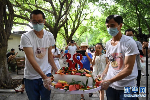 8月16日,由參加“新星”38歲生日會的大熊貓“粉絲”與工作人員一起制作的水果生日蛋糕亮相重慶動物園熊貓館。 當日,世界現(xiàn)存最年長圈養(yǎng)大熊貓“新星”迎來38歲生日,重慶動物園為“老壽星”舉行了生日會。“新星”的年齡相當于人類的110至150歲,目前身體狀況良好。 大熊貓“新星”1982年出生于四川寶興縣野外,1983年來到重慶動物園。 新華社記者 唐奕 攝