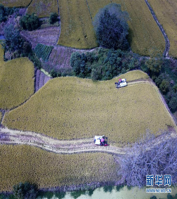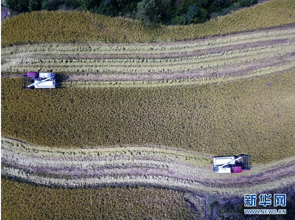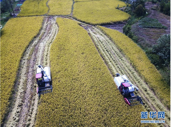 9月26日,花崗鎮(zhèn)河豐社區(qū)農(nóng)民駕駛收割機(jī)收割水稻(無人機(jī)照片)。 近日,安徽省肥西縣花崗鎮(zhèn)河豐社區(qū)水稻陸續(xù)成熟,當(dāng)?shù)剞r(nóng)民搶抓晴好天氣收割水稻,力爭(zhēng)讓稻谷顆粒歸倉。 新華社記者劉軍喜攝
