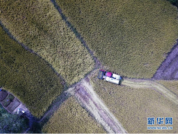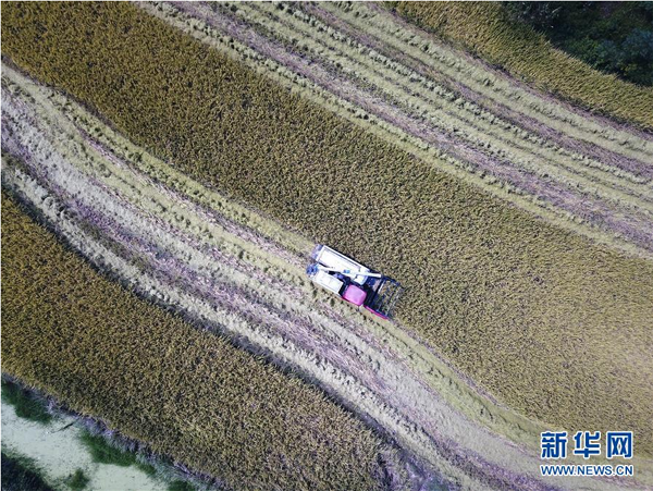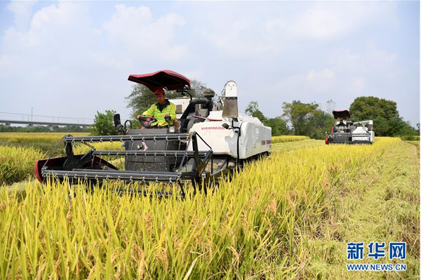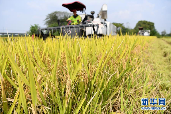 9月26日,花崗鎮(zhèn)河豐社區(qū)農(nóng)民駕駛收割機(jī)收割水稻。 近日,安徽省肥西縣花崗鎮(zhèn)河豐社區(qū)水稻陸續(xù)成熟,當(dāng)?shù)剞r(nóng)民搶抓晴好天氣收割水稻,力爭(zhēng)讓稻谷顆粒歸倉。 新華社記者劉軍喜攝