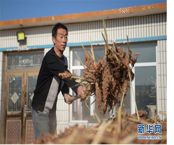 內(nèi)蒙古自治區(qū)奈曼旗青龍山鎮(zhèn)互利村脫貧戶(hù)王洪巖在干農(nóng)活(11月4日攝)。 新華社記者 李志鵬 攝