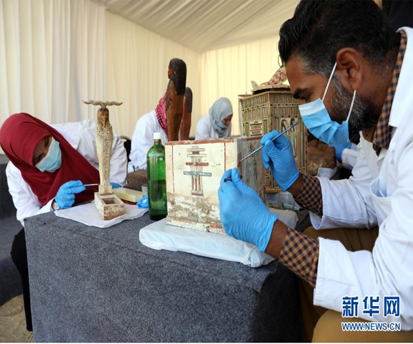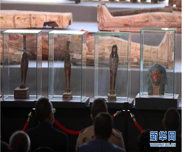 這是11月14日在埃及吉薩拍攝的彩繪木棺和其他出土文物。埃及旅游和文物部長哈立德·阿納尼14日宣布,在吉薩省塞加拉地區(qū)出土100具距今約2500年的彩繪木棺,這是埃及本年度最大的考古發(fā)現(xiàn)。新華社發(fā)(艾哈邁德·戈馬攝)
