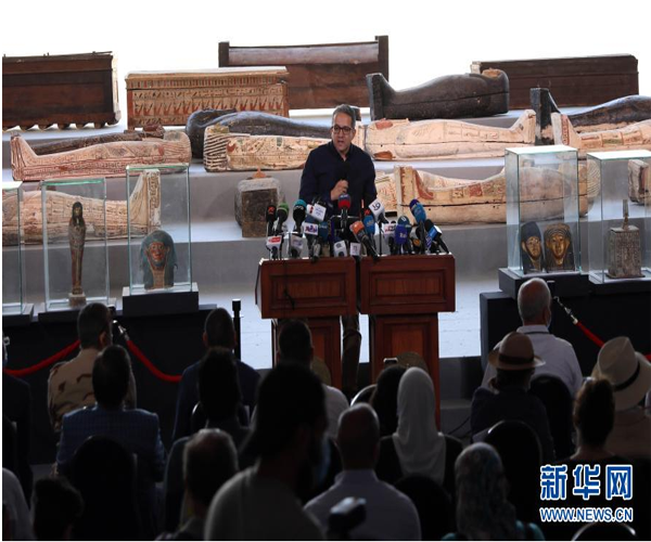 11月14日,在埃及吉薩,埃及旅游和文物部長哈立德·阿納尼在彩繪木棺發(fā)現(xiàn)現(xiàn)場講話。埃及旅游和文物部長哈立德·阿納尼14日宣布,在吉薩省塞加拉地區(qū)出土100具距今約2500年的彩繪木棺,這是埃及本年度最大的考古發(fā)現(xiàn)。新華社發(fā)(艾哈邁德·戈馬攝)