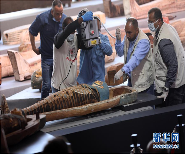 11月14日,在埃及吉薩,考古工作人員對木棺內(nèi)的木乃伊進行X光檢查。埃及旅游和文物部長哈立德·阿納尼14日宣布,在吉薩省塞加拉地區(qū)出土100具距今約2500年的彩繪木棺,這是埃及本年度最大的考古發(fā)現(xiàn)。新華社發(fā)(艾哈邁德·戈馬攝)
