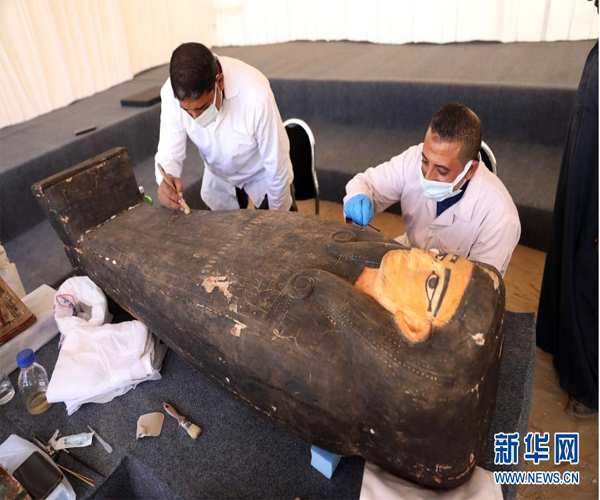 11月14日,在埃及吉薩,考古工作人員清理一具彩繪木棺。埃及旅游和文物部長哈立德·阿納尼14日宣布,在吉薩省塞加拉地區(qū)出土100具距今約2500年的彩繪木棺,這是埃及本年度最大的考古發(fā)現(xiàn)。新華社發(fā)(艾哈邁德·戈馬攝)