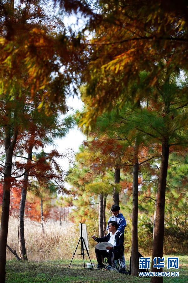 11月15日,繪畫愛好者在江蘇省泗洪縣洪澤湖濕地的杉樹林中寫生。初冬時(shí)節(jié),洪澤湖濕地中的杉樹林猶如披上多彩外衣,色彩斑斕,美不勝收。新華社發(fā)(許昌亮 攝)