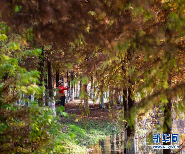 11月15日,游人在江蘇省泗洪縣洪澤湖濕地的杉樹林中游覽。初冬時(shí)節(jié),洪澤湖濕地中的杉樹林猶如披上多彩外衣,色彩斑斕,美不勝收。新華社發(fā)(許昌亮 攝)