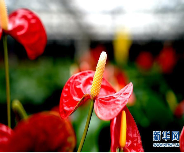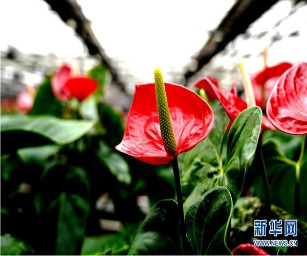 1月21日,在上海鮮花港拍攝的紅掌新品種“紅裝”。 近日,上海鮮花港自主研發(fā)的兩個(gè)紅掌新品種“紅胭”“紅裝”獲得國家植物新品種授權(quán)。目前,上海鮮花港已建成紅掌品種資源圃,收集保存紅掌品種達(dá)100多個(gè)。 新華社記者 張建松 攝