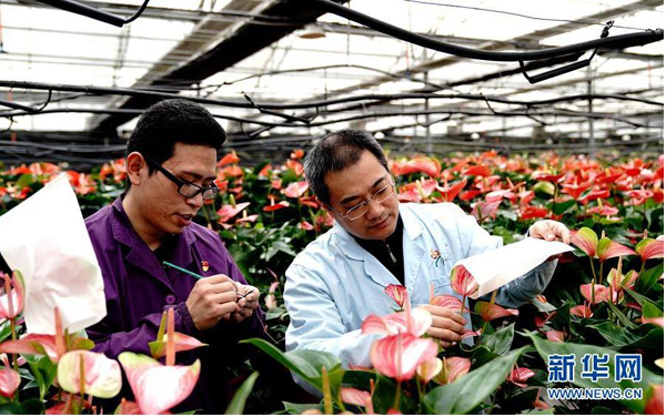 1月21日,上海鮮花港技術(shù)總監(jiān)王暉(右)給人工授粉的紅掌進(jìn)行隔離保護(hù)。 近日,上海鮮花港自主研發(fā)的兩個(gè)紅掌新品種“紅胭”“紅裝”獲得國家植物新品種授權(quán)。目前,上海鮮花港已建成紅掌品種資源圃,收集保存紅掌品種達(dá)100多個(gè)。 新華社記者 張建松 攝