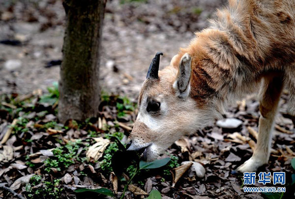 1月31日,上海動物園“??茖殞?rdquo;——旋角羚寶寶在覓食。