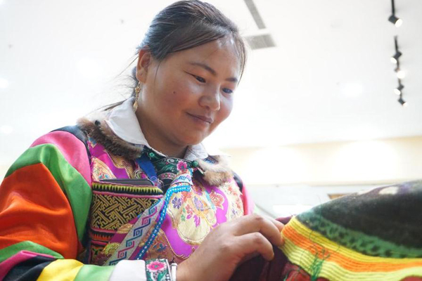 土族繡娘索英梅在繡“太陽花”(3月5日攝)。新華社記者 央秀達珍 攝