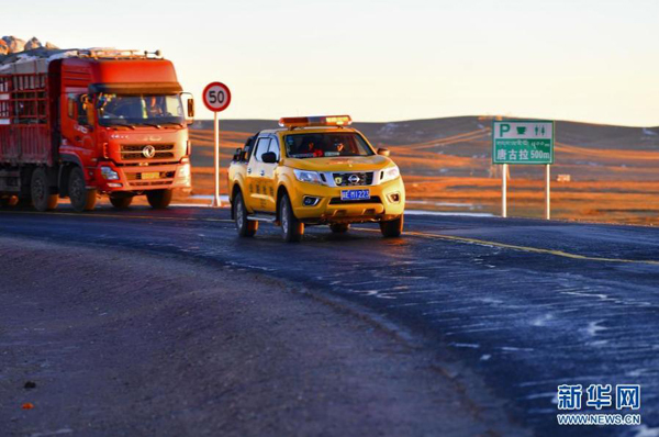 安多公路養(yǎng)護(hù)段工作人員在國道109唐古拉山口路段巡查(1月13日攝)。新華社記者 張汝鋒 攝