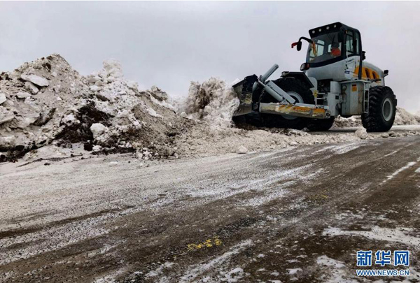 在國道109線K3378路段,安多公路養(yǎng)護(hù)段投入大型機(jī)械清除冰雪(2019年2月16日攝)。新華社發(fā)(邊巴央吉 攝)