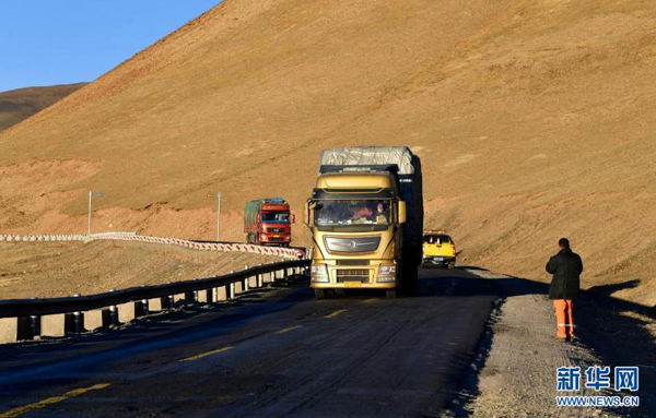 安多公路養(yǎng)護(hù)段巡護(hù)車和一輛貨車行進(jìn)在國道109唐古拉山口路段(1月13日攝)。新華社記者 張汝鋒 攝