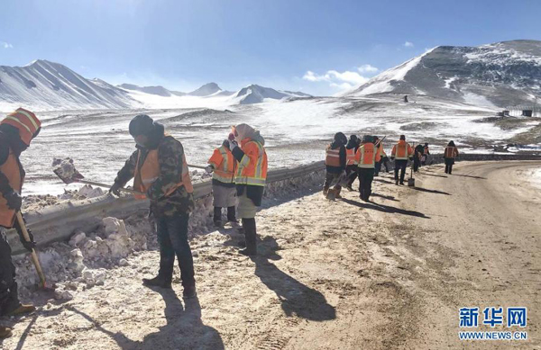 在國道109線K3349路段,安多公路養(yǎng)護(hù)段工作人員進(jìn)行除雪除冰作業(yè)(2019年2月13日攝)。新華社發(fā)(邊巴央吉 攝)