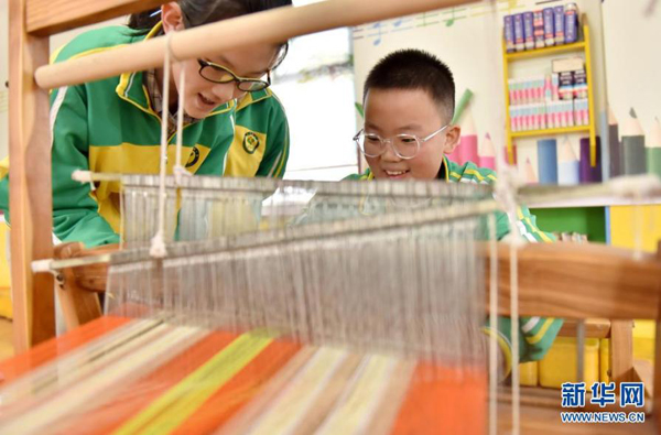 4月7日,威縣第四小學(xué)學(xué)生在體驗(yàn)老粗布紡織技藝。近年來,河北省邢臺(tái)市威縣積極開展“非遺傳承進(jìn)校園”活動(dòng),將當(dāng)?shù)靥厣沁z項(xiàng)目引入學(xué)校課堂,讓學(xué)生近距離感受民間傳統(tǒng)技藝的魅力,促進(jìn)非遺文化的保護(hù)和傳承。新華社記者 朱旭東 攝