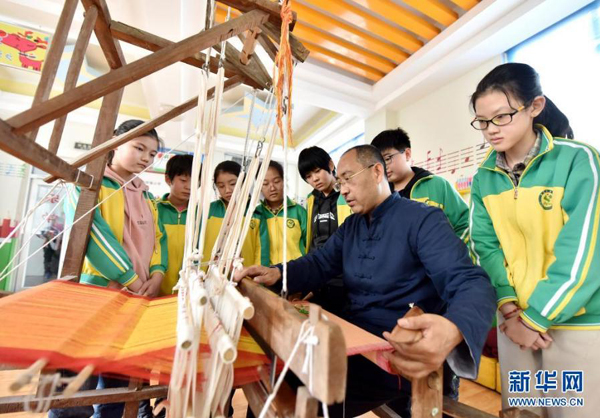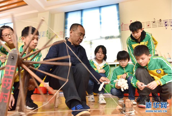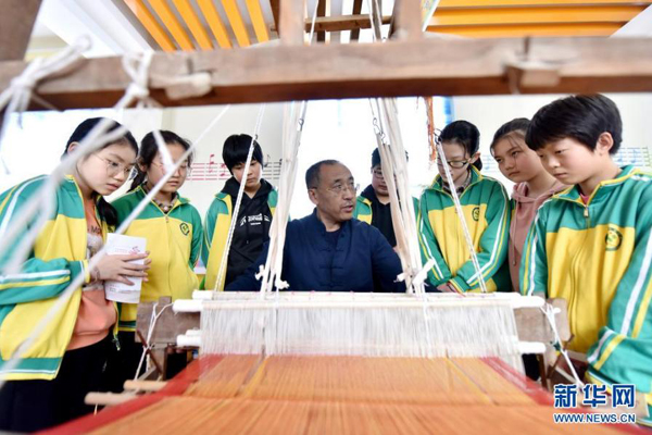 4月7日,威縣土布紡織技藝傳承人高慶海在威縣第四小學(xué)向?qū)W生演示老粗布紡織技藝。近年來,河北省邢臺(tái)市威縣積極開展“非遺傳承進(jìn)校園”活動(dòng),將當(dāng)?shù)靥厣沁z項(xiàng)目引入學(xué)校課堂,讓學(xué)生近距離感受民間傳統(tǒng)技藝的魅力,促進(jìn)非遺文化的保護(hù)和傳承。新華社記者 朱旭東 攝