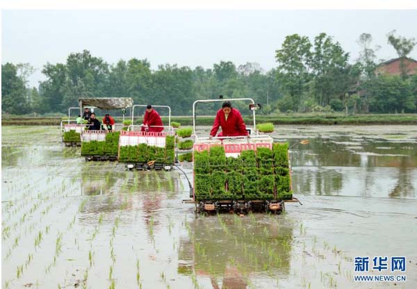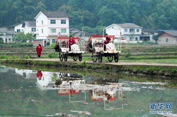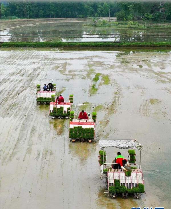 4月19日, 四川省廣安市鄰水縣一家種植合作社的社員操作插秧機(jī)栽插糯稻秧苗。