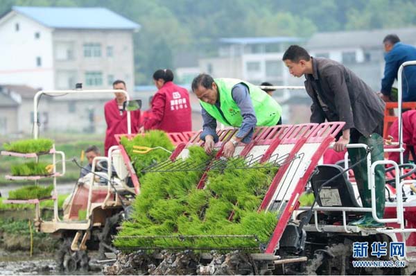4月19日, 四川省廣安市鄰水縣一家種植合作社的農(nóng)機(jī)員將糯稻秧苗放進(jìn)插秧機(jī)。