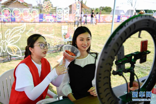 4月29日,南潯區(qū)石淙鎮(zhèn)黨員志愿者(左)通過直播帶貨的形式推介石淙清水小龍蝦。